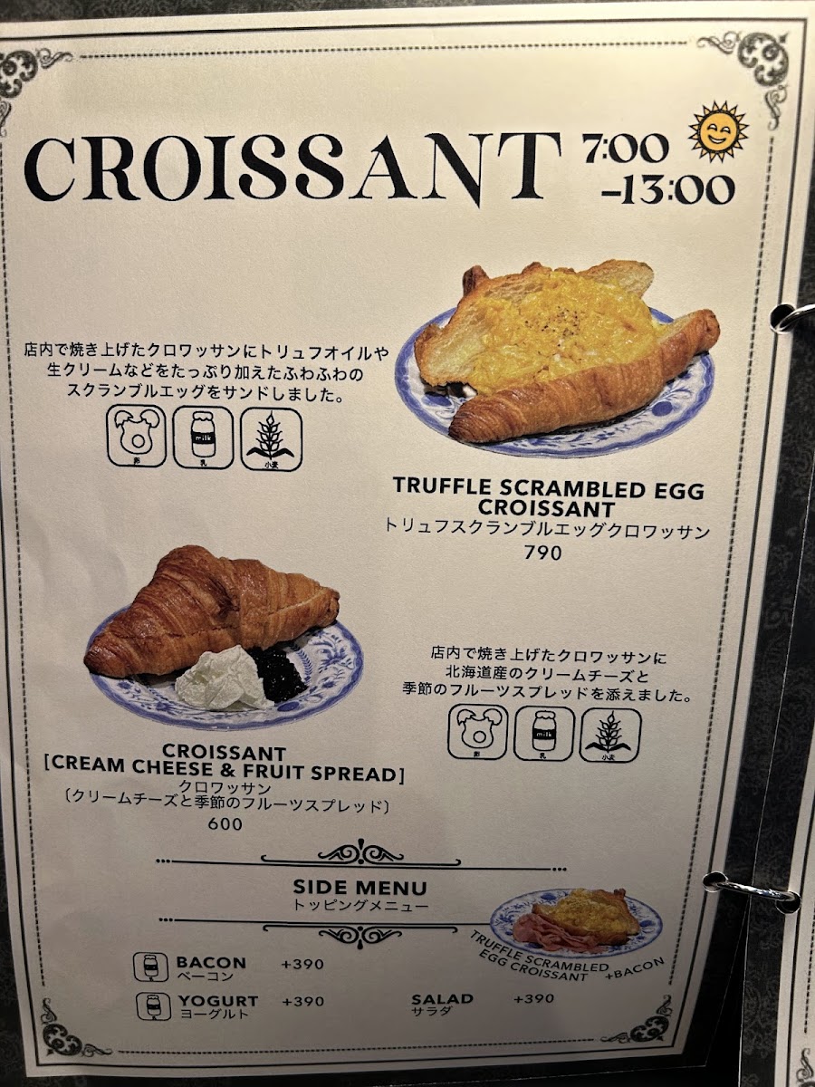 In addition to drinks, the menu includes light food choices such as morning plates and snacks like あんバターたい焼き (a sweet-filled pastry). Customers can also find savory options including dishes like truffle scrambled eggs on croissants and salmon with ikura. Desserts such as matcha cheesecake and basque cheesecake are part of the menu as well, providing a range of options from sweet treats to light meals.