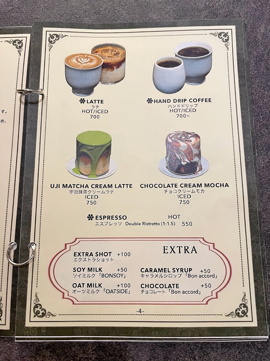 The menu at OMOFU 【Roastery cafe】 offers a selection of beverages and light food items suitable for breakfast, coffee breaks, and casual dining. As a coffee roastery and cafe, the menu features various coffee drinks including pour-over coffee made from single-origin beans roasted in-house. Cold and hot coffee options are complemented by specialty drinks such as iced matcha latte and matcha cream latte.